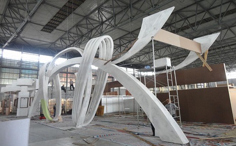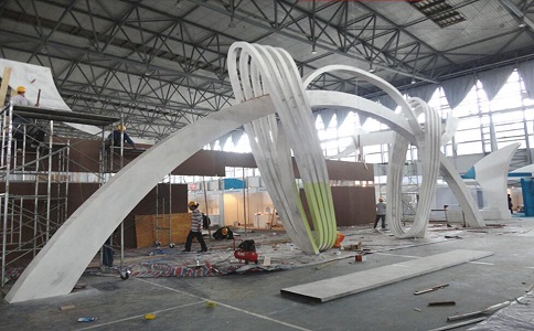 主要材料:木板、鋼管、方鋼、軟膜天花、燈片、有機片、景觀燈、環保地毯,寫真、播音軟貼。